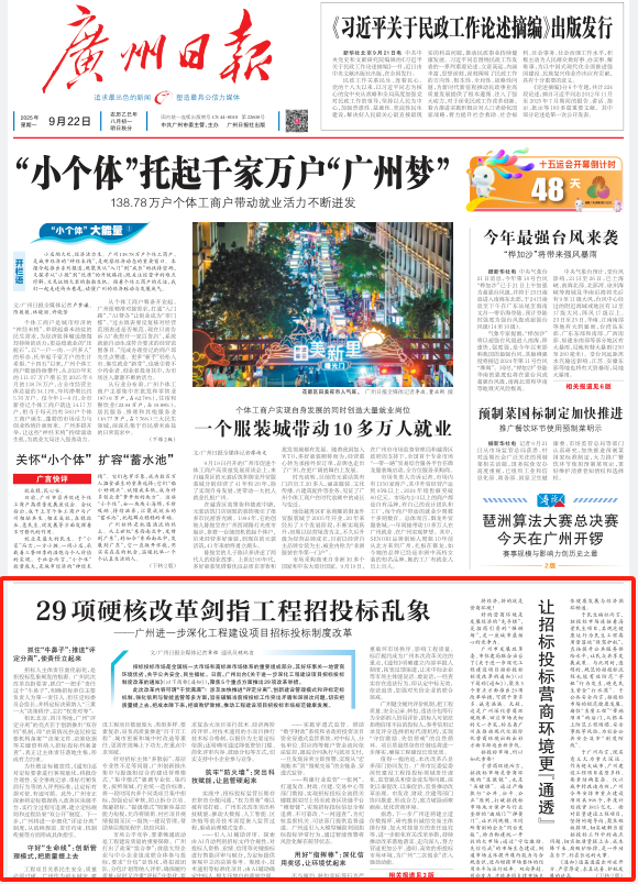 據(jù)悉,下一步廣州還將建立造價(jià)數(shù)據(jù)庫(kù)、研究推出誠(chéng)信交易主體排行榜、加大對(duì)掛靠方的責(zé)任追究等,進(jìn)一步細(xì)化有關(guān)改革舉措,持續(xù)推動(dòng)改革落地落實(shí)、走向深入,努力營(yíng)造更加公平、透明、高效的招投標(biāo)市場(chǎng)環(huán)境,為廣州“二次創(chuàng)業(yè)”注入強(qiáng)勁動(dòng)能。